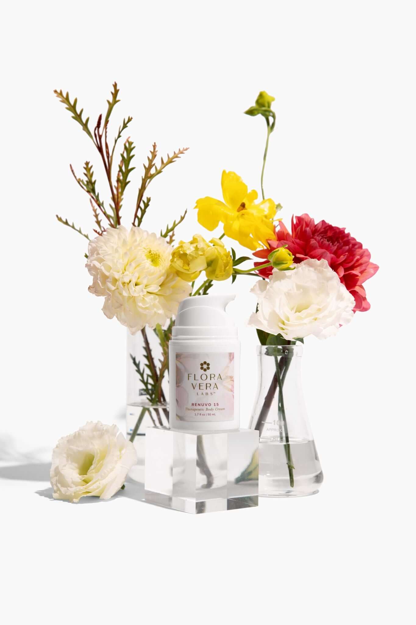 - Renuvo 15 Therapeutic Body Cream (50 mL):Â A potent blend of our Floral Infusion & 15 floral adaptogens delivers instant cooling and soothing warmth for targeted pain & stress relief.